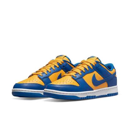 Make a statement on the streets in the nike Dunk Low UCLA. Innovatively designed to perfectly replicate the colors of University of California Los Angeles, this sneaker features a golden and blue upper made from a supple leather that slides into laces, allowing you to securely lock your foot in place for maximum comfort. Topped off with signature blue detailing on a golden tongue and contrasting white midsole for an airy break, capture all eyes with this stylish pair no matter where you walk. Make sure your next move is on point and make it with the nike Dunk Low UCLA.