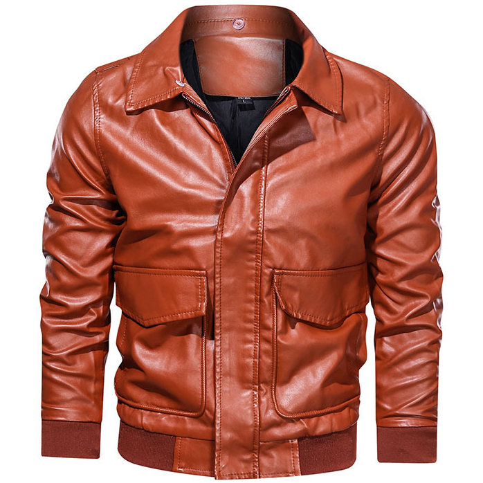 Men's Lapel Solid Color Large Pocket Biker Leather Jacket